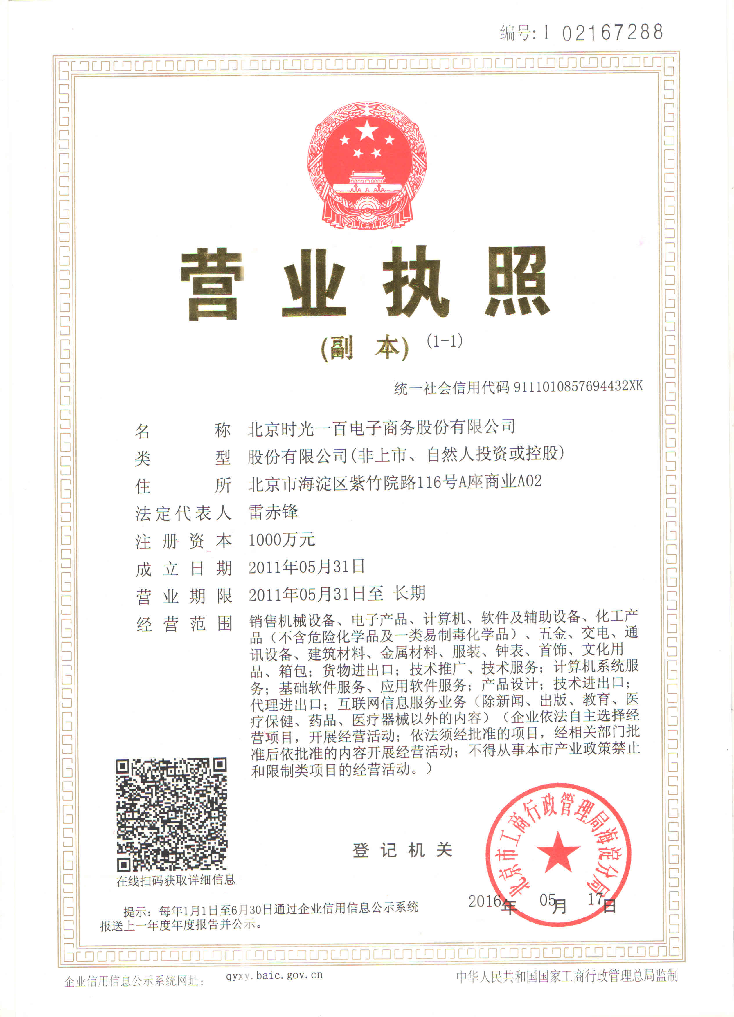 北京时光一百电子商务股份有限公司 联系电话:400-050-1000