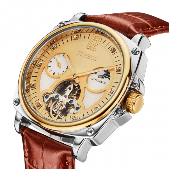 时光一百 休闲商务月相镂空机械表皮带男表