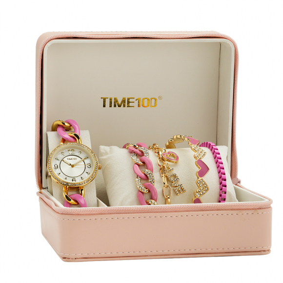 时光一百(TIME100)女表小表盘简约防水女士腕表套装女手链手表七夕礼物送女友W50888L钢色