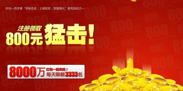 浪漫圣诞,快乐元旦,12月15日至1月15日,中国首个互联网手表时光一百(www.time100.cn),将在网站上线同期推出各种疯狂促 销:注册就送800元现金红包、0元团购,与好友共赢双积分购物免单,此轮将送出多达8000万红包等你来拿,如此好机会千万不可错过。三重促销狂潮,重...更多>>