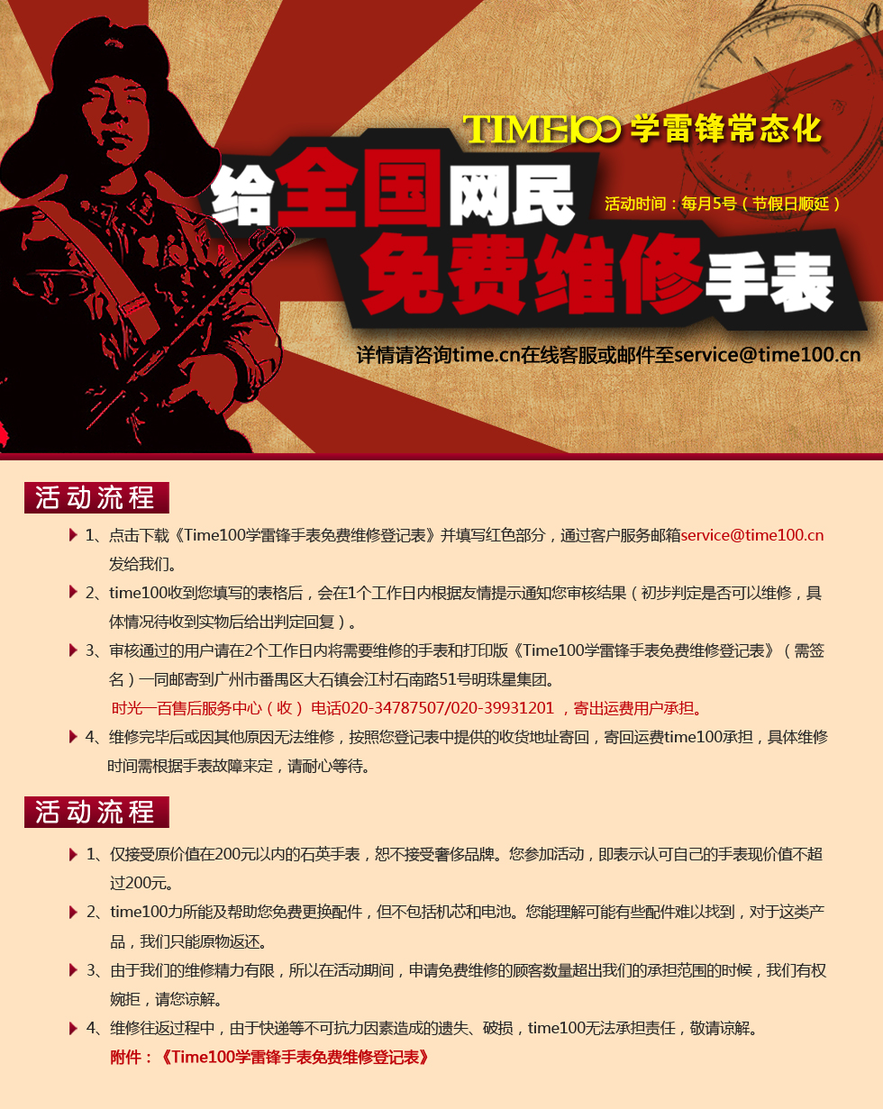 1、点击下载《Time100学雷锋手表免费维修登记表》并填写红色部分,通过客户服务邮箱service@time100.cn发给我们